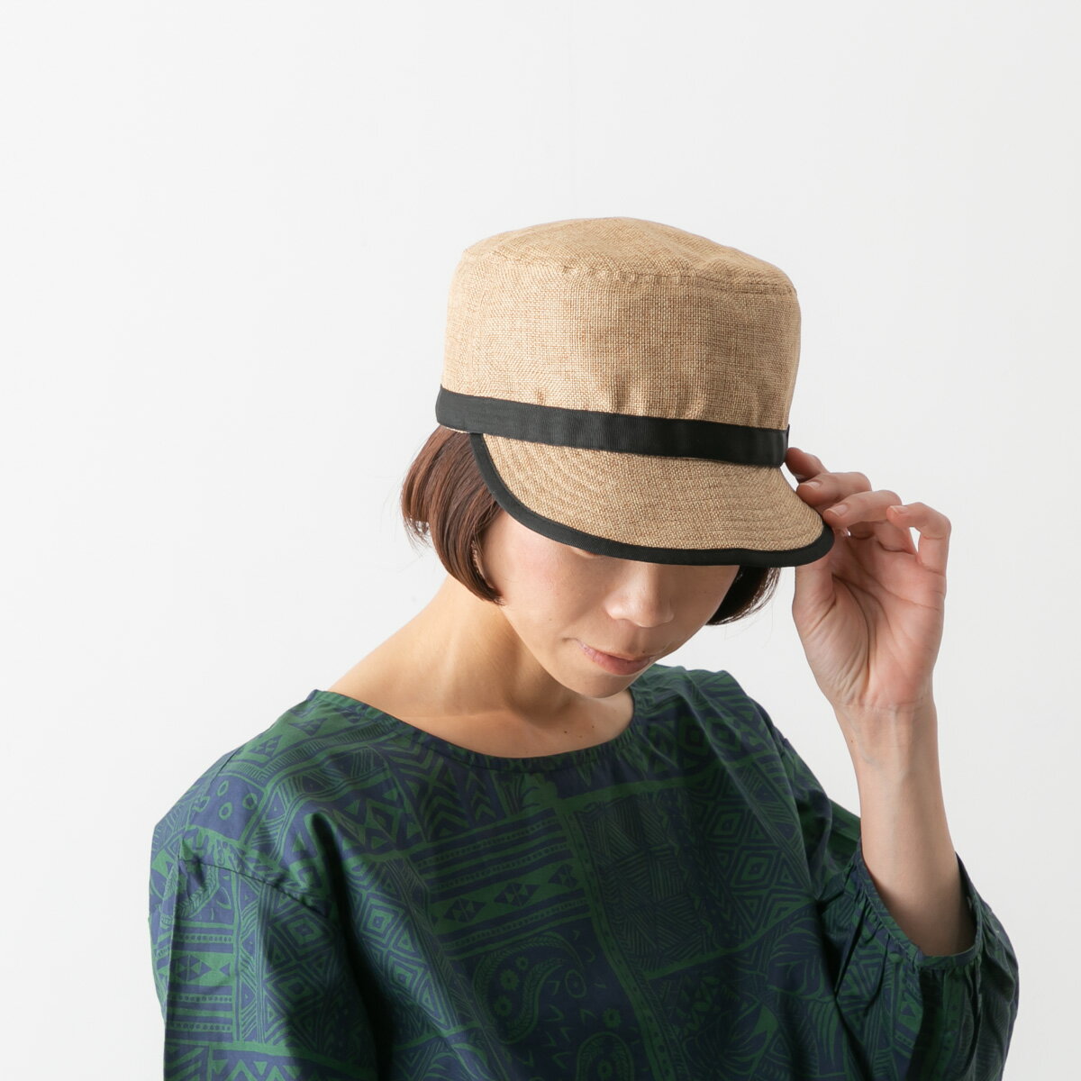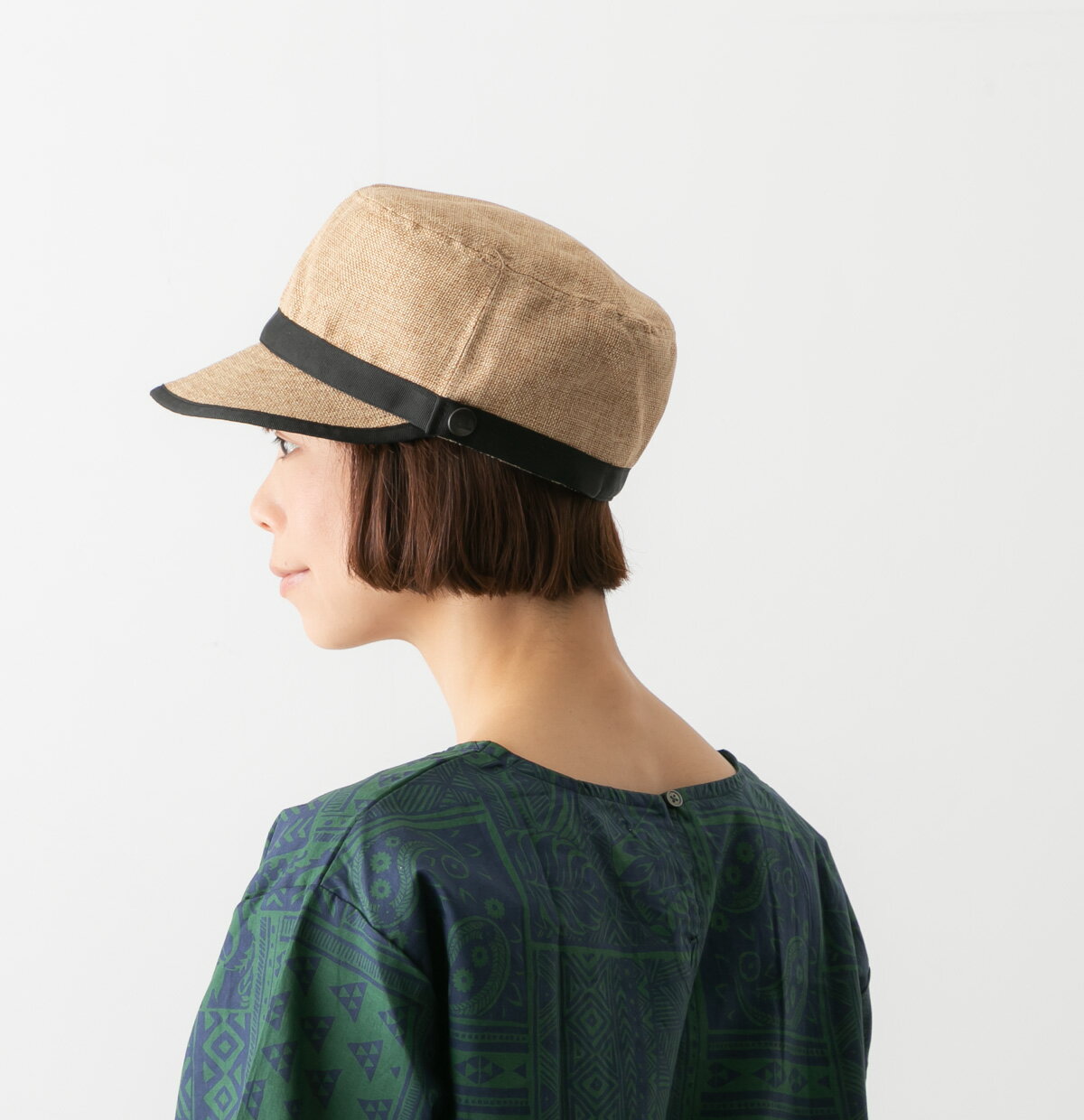 シンプルなデザインの中に、つばまわりのパイピングでアクセント。