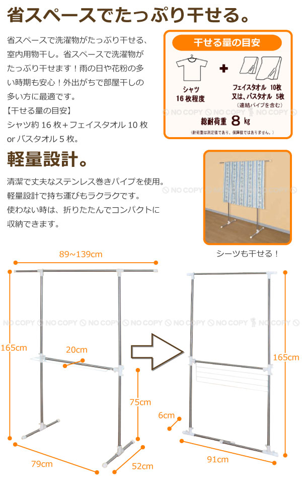 サイズ 幅89〜139x奥行52x高さ165cm 収納時:幅91x奥行6x高さ165cm 素材・材質 ステンレス巻きパイプ(直径22mm/19mm) タオル掛け:スチール(エポキシ樹脂粉体塗装) 樹脂部:ABS樹脂/PP樹脂 ネジ:鉄製(メッキ仕上げ) 重量 2.4kg 耐荷重 8kg