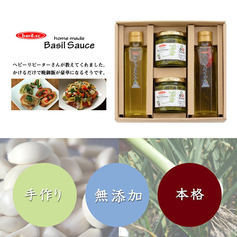 【名称】こだわりのバジルソース、ガーリックオイル、ハーブオイルのギフトセット 【内容量】こだわりのバジルソース140g×2ガーリックオイル130gハーブオイル130g 【賞味期限】こだわりのバジルソース 120日ガーリックオイル 360日ハーブオイル 360日 【原材料】※無添加:合成着色料・防腐剤等は一切使用しておりません。